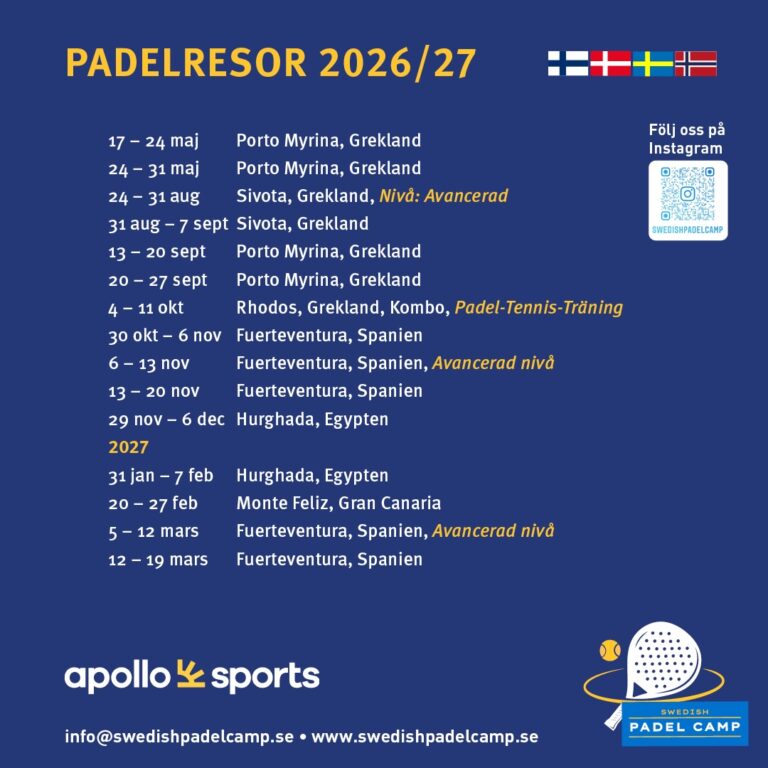 Upplev en padelresa utöver det vanliga i exklusivt samarbete med Swedish Padel Camp, där vi tar dig med till träningsparadiset Aqua Vista – powered by Playitas i Hurghada. Njut av en vecka fylld med intensivt och coachat padelspel, där varje dag är en möjlighet att förbättra din teknik och utvecklande matchspel.